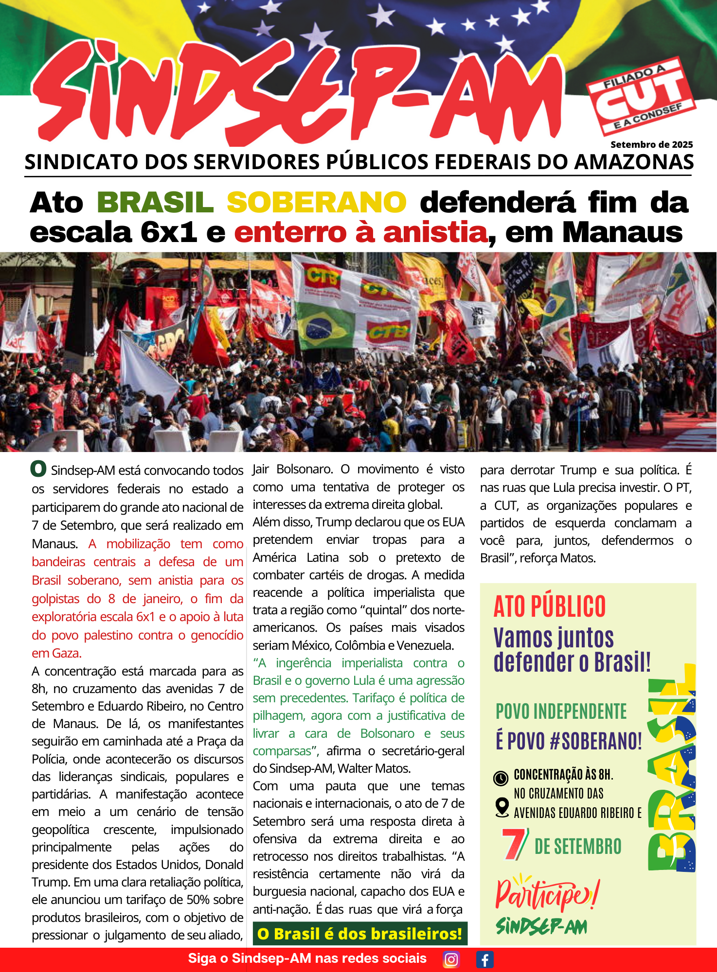 Boletins ATO BRASIL SOBERANO DEFENDERÁ FIM DA ESCALA 6X1 E ENTERRO À ANISTIA, EM MANAUS 2 de setembro de 2025 · por sindsep-am · atualizado em 2 de setembro de 2025 Tags: ← Redução da jornada de trabalho para 36 horas entra em debate na CCJ Não é reforma, é demolição! →