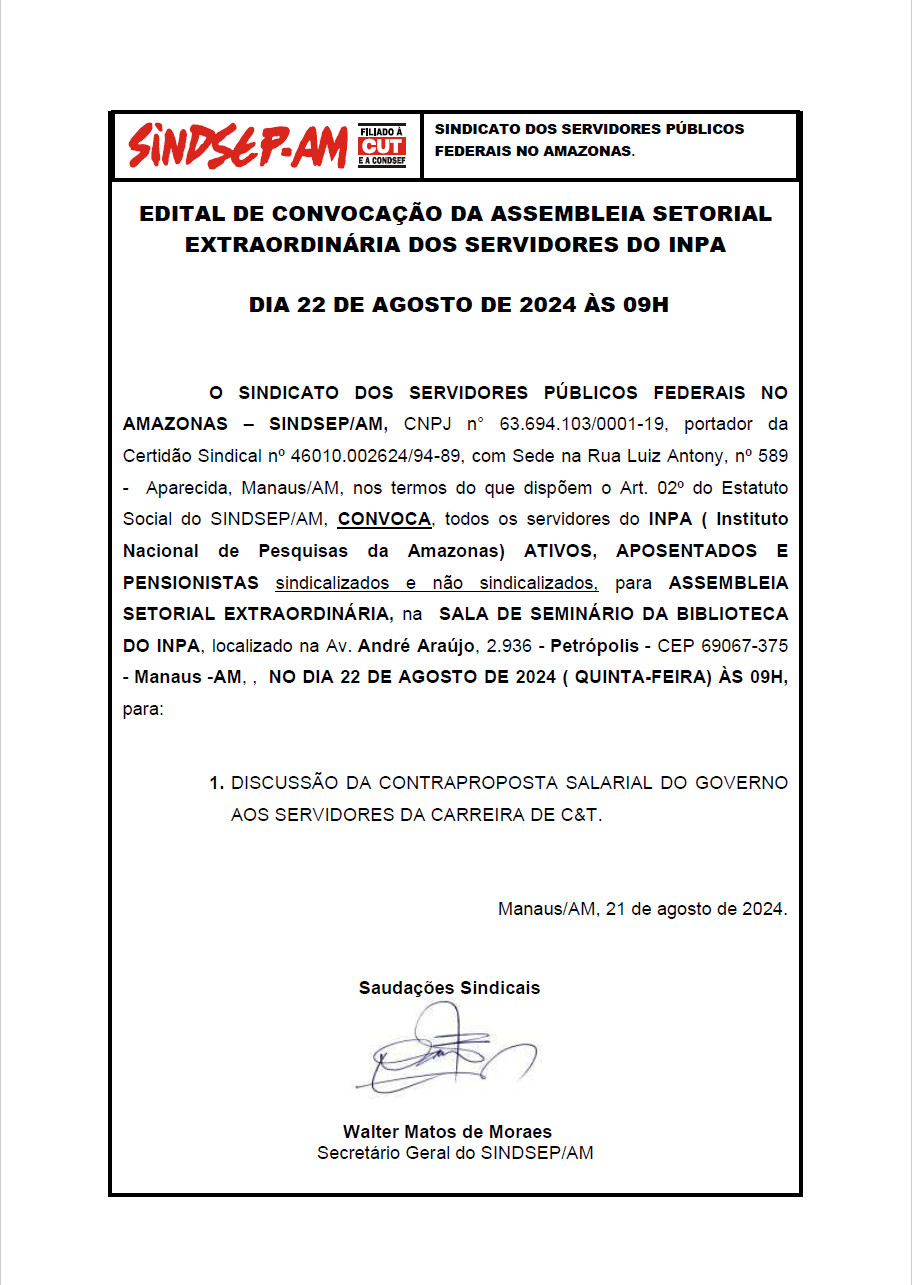 EDITAL DE CONVOCAÇÃO DA ASSEMBLEIA SETORIAL EXTRAORDINÁRIA DOS SERVIDORES DO INPA