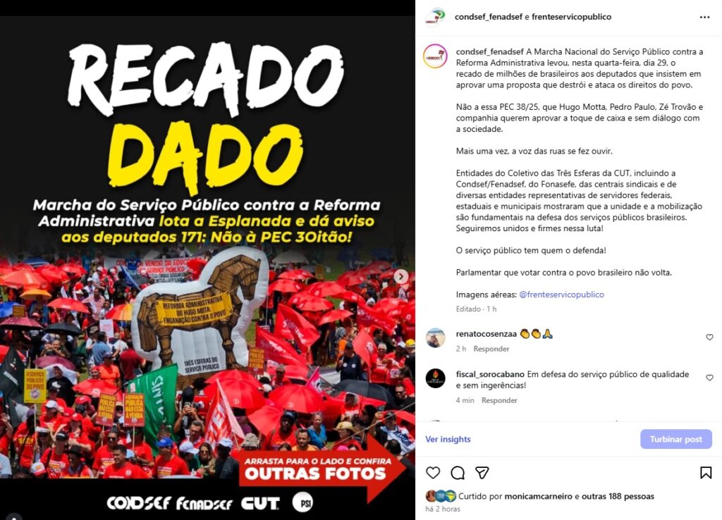 Em destaque, críticas ao conteúdo da proposta de Hugo Motta, Pedro Paulo, Zé Trovão e companhia, que transformam o serviço público em um balcão de negócios. Diversos parlamentares participaram da atividade e levaram palavras de apoio aos servidores e serviços públicos e contrárias à PEC Três Oitão como está sendo chamada pelas diversas entidades representativas de servidores federais, estaduais e municipais. Entre as críticas, a forma como a proposta tem sido conduzida na Câmara dos Deputados, “empurrada a toque de caixa” sem diálogo com a sociedade. A reforma proposta pela PEC 38/25 é um verdadeiro tiro nos direitos da população, mata os serviços públicos e precariza o atendimento à população.