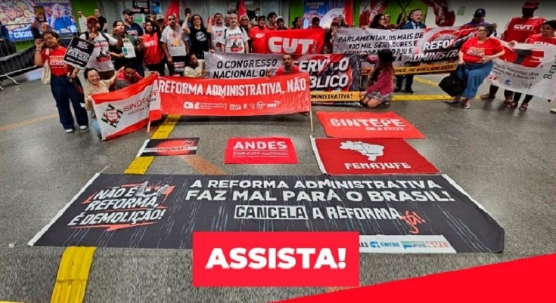 Na reta final de 2025, a mobilização contra a PEC 38, a reforma administrativa inimiga do povo, segue firme. Nesta terça-feira (2), direções da Condsef, do Sindsep-DF e demais entidades filiadas à CUT realizaram mais um ato no aeroporto de Brasília com o objetivo de pressionar parlamentares a votarem contra a proposta.
