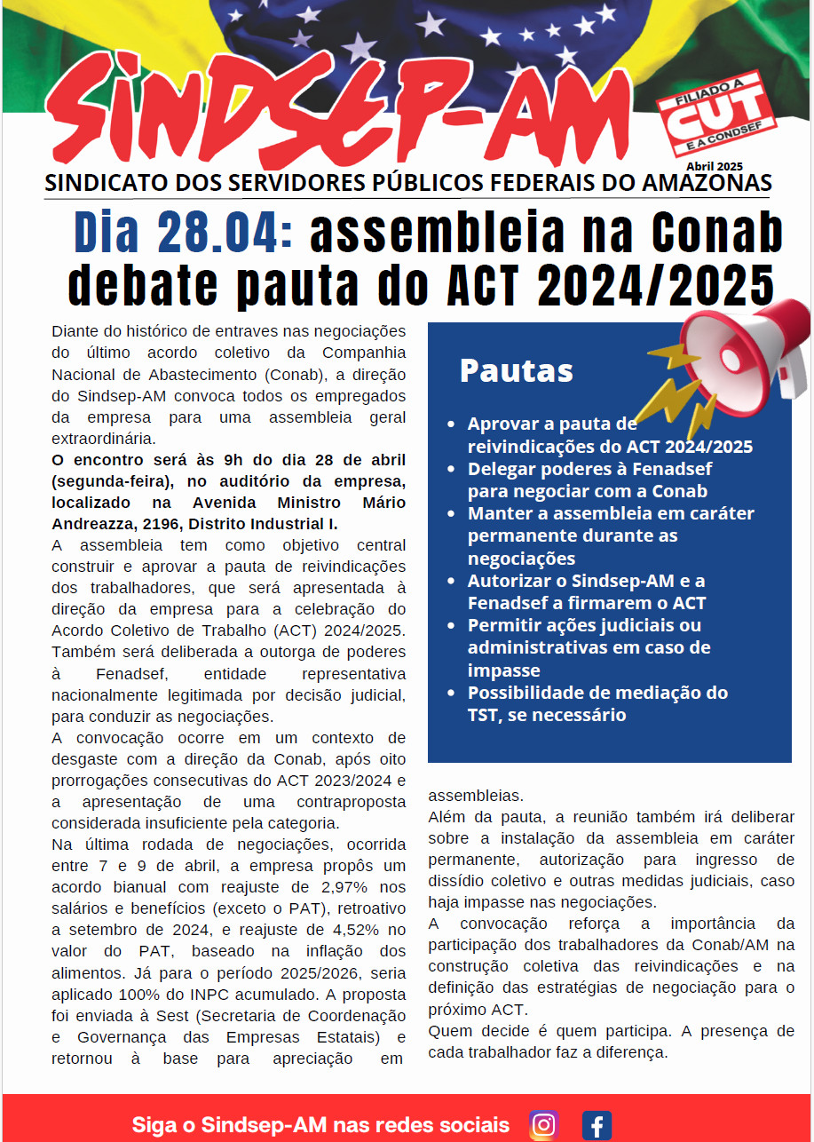 Destaques 28 de abril de 2025 Trabalhadores da Conab-AM rejeitam proposta de ACT e defendem mobilização nacional
